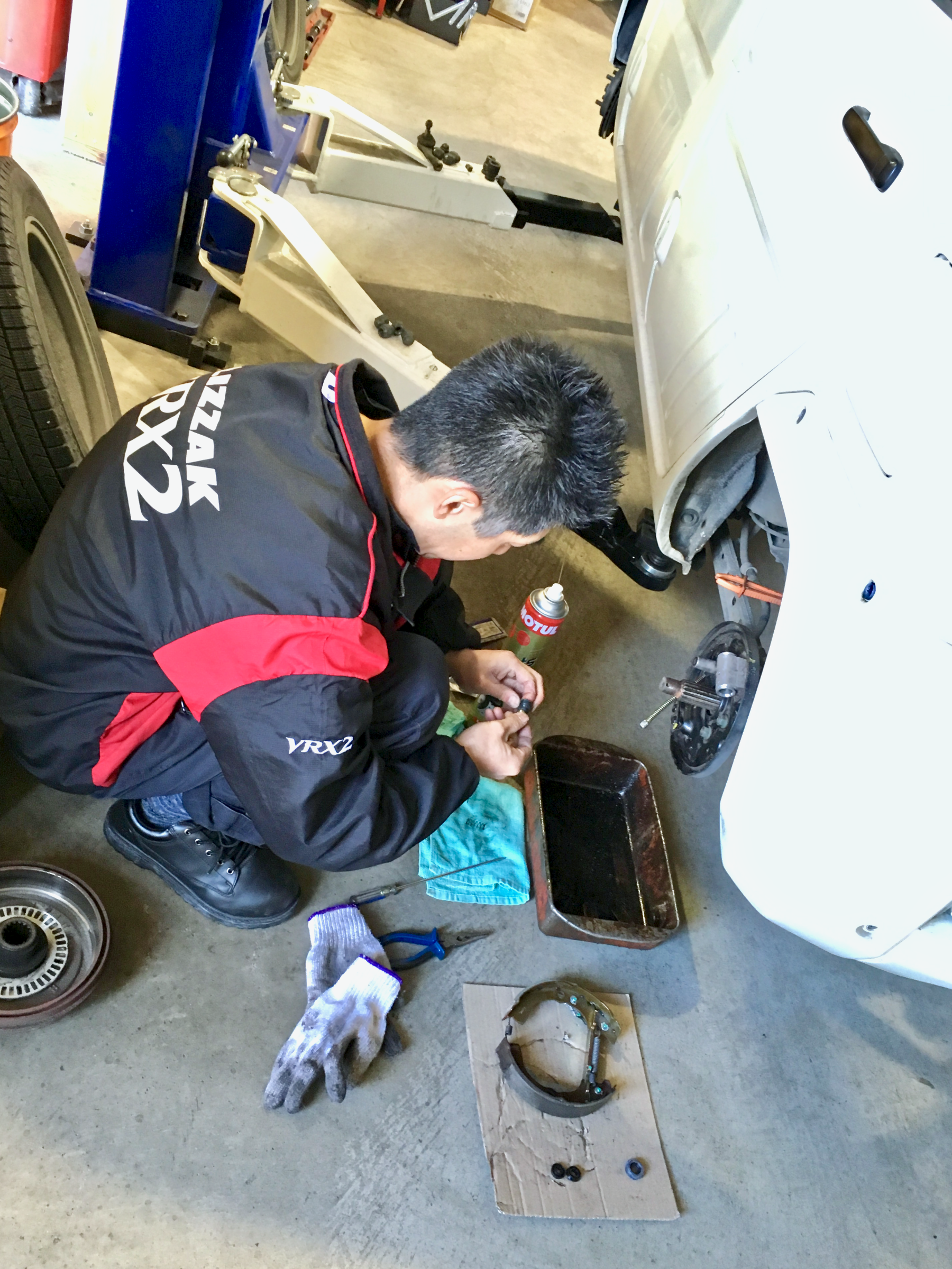 境くんがモゾモゾと何かやってますね。ホイールシリンダーO/Hですか。いわゆるRカップですね。