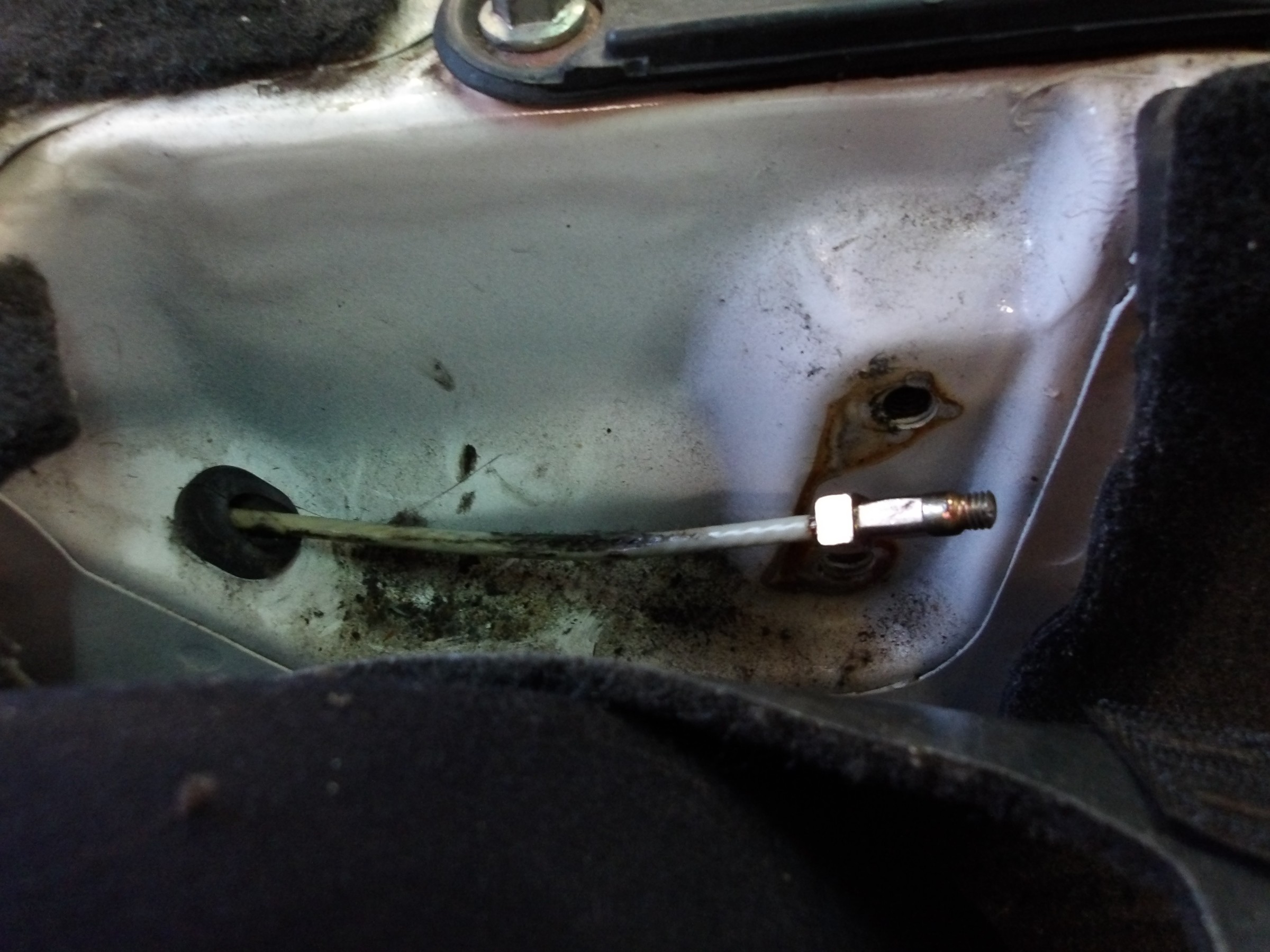 サイドブレーキのワイヤーのフロント側(室内側)のアジャスターのネジが