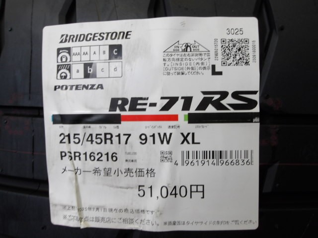 「ポテンザ RE-71RS」を装着致しました。
