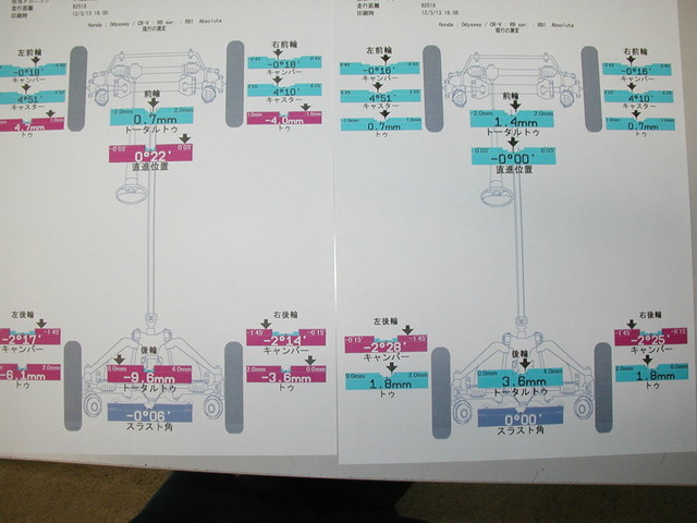 2013年12月3日 ツイート 自動車板金工場様からの御依頼により、ホンダ オッデセイ(RB1)のアライメント測定&調整作業を行いました。この車の標準アライメント調整箇所は前後のトーが調整出来ます。いつも御利用ありがとうございます。またの御利用をお待ちしております。 Prev Next