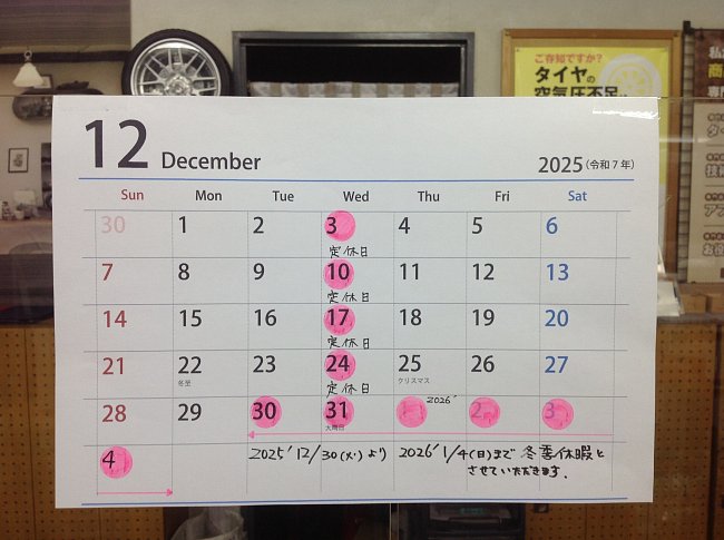 12月定休日と年末年始冬季休暇のおしらせ ♪