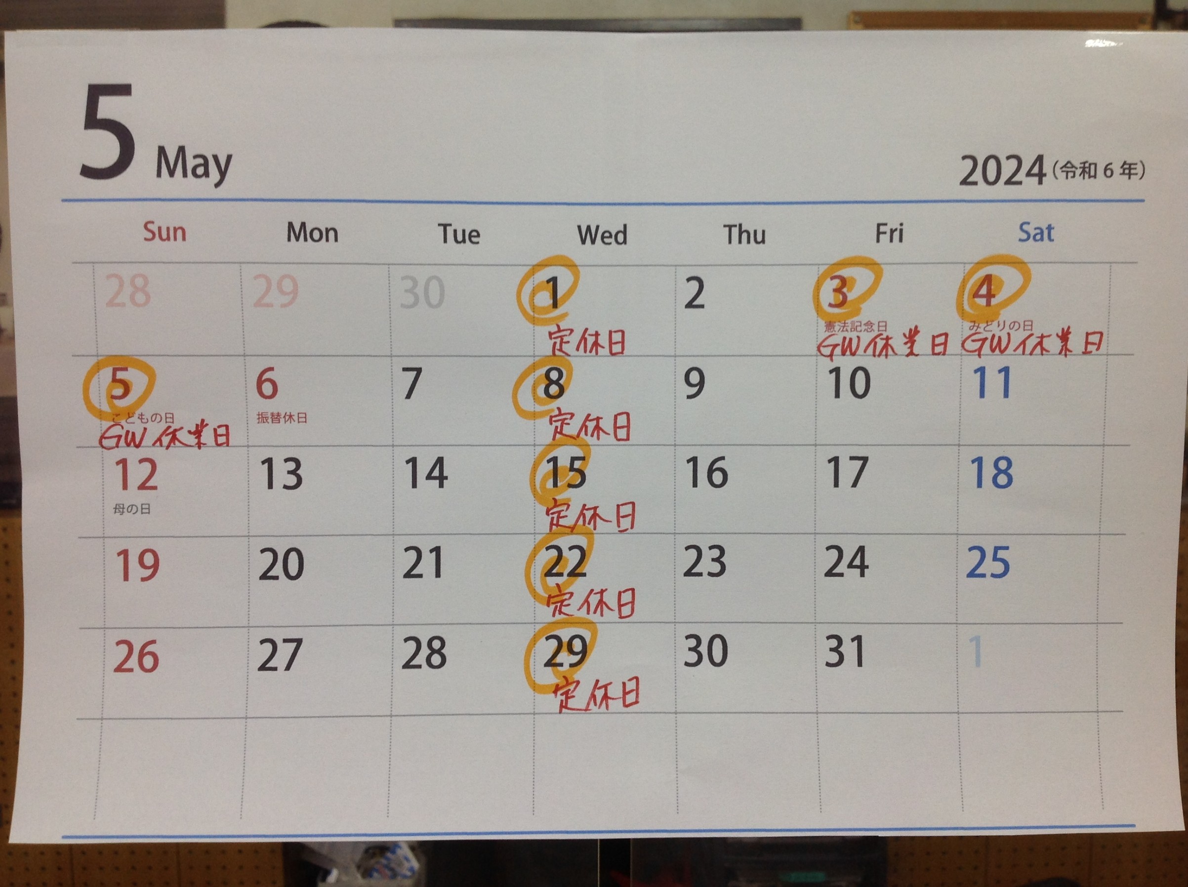当店の5月の休業日は毎週水曜日の定休日に加え、