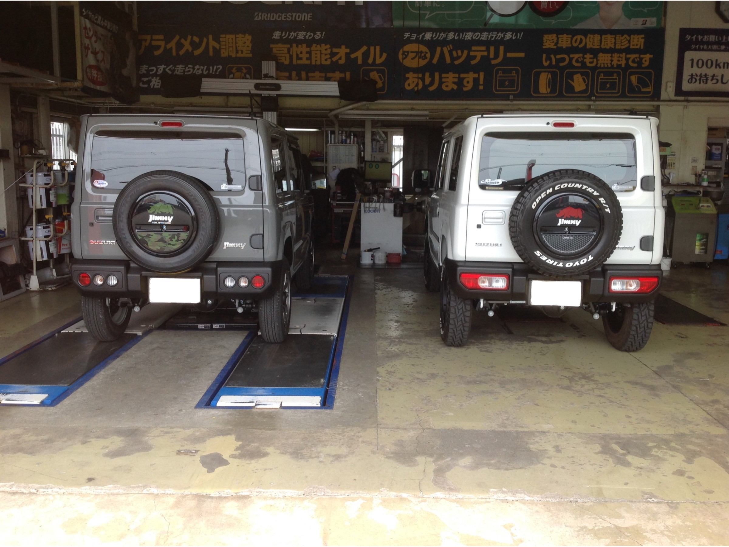右のホワイトジムニーさんは1インチリフトアップ済みでして、