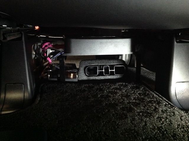 パワーアンプは助手席下にステーを加工して、エアコンダクトをかわすよう取り付けました。