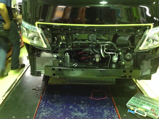 慎重にマスキング&養生を施しながらバンパーを外し、装着場所の検索から…