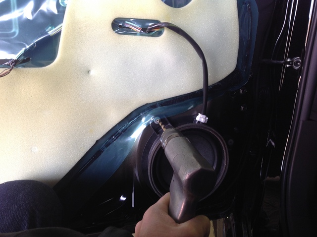 サクサクゥ~とドア内貼りを外し、リベット留めされているスピーカーを取り外します。