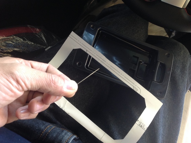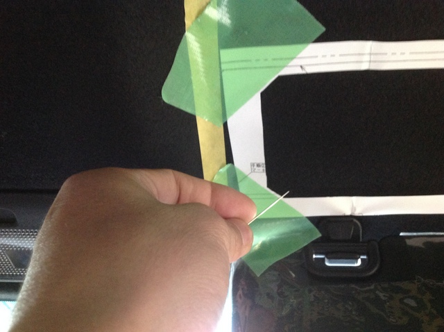 型紙を貼り付け、まち針を刺しながら内貼りのクリアランスを測っていきます。