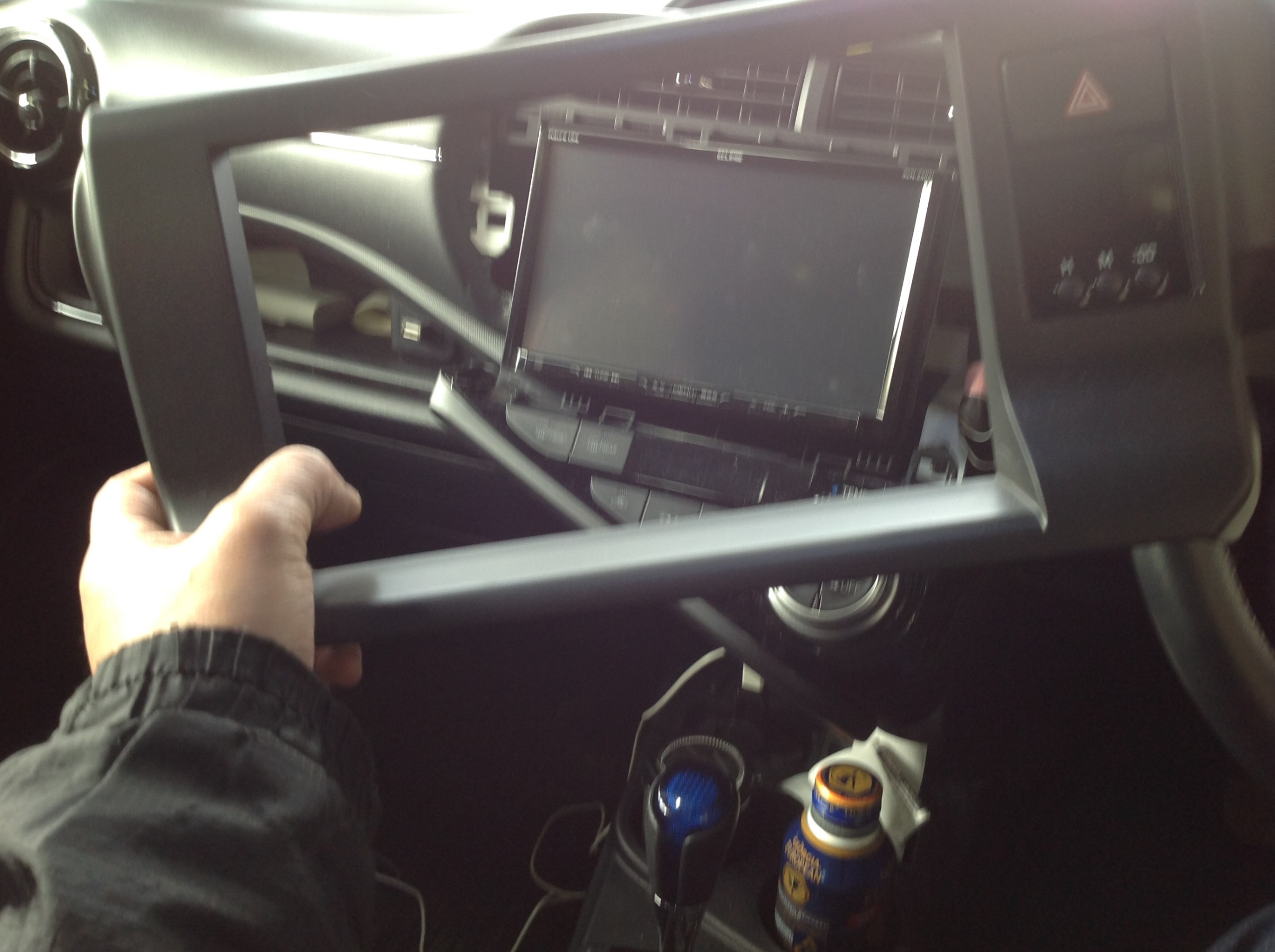 作業中、なにげに外したナビ本体を艶々のピアノブラックのパネルにあてがってみると……