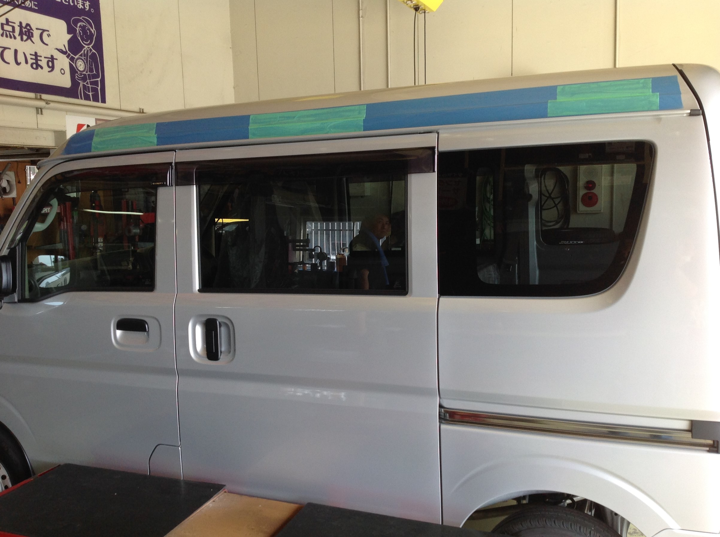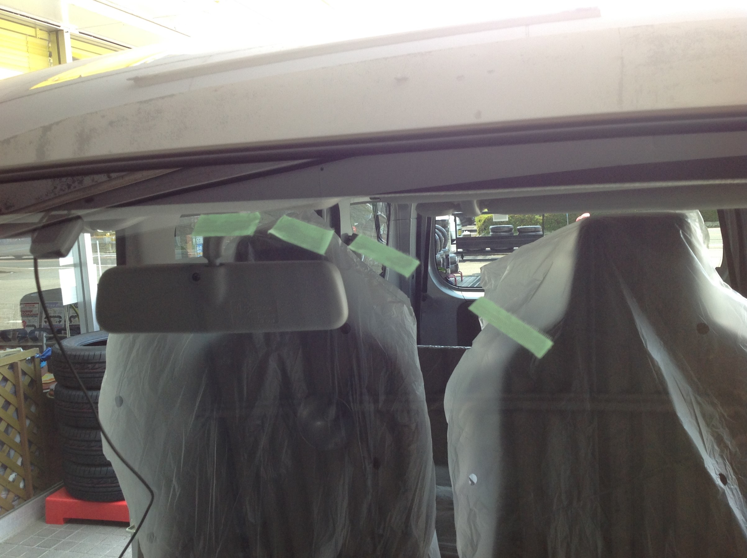 フル養生し、位置決め後に3人がかりで慎重にルーフへ設置♪