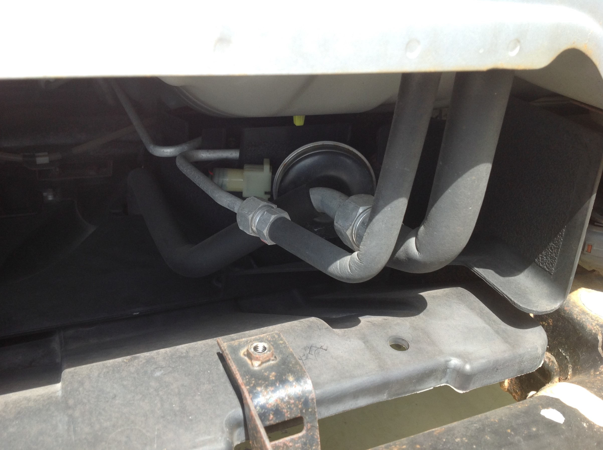 純正ホーンはエアコンの配管サイドにあり、本体は取り外さず配線だけ拝借 ♪