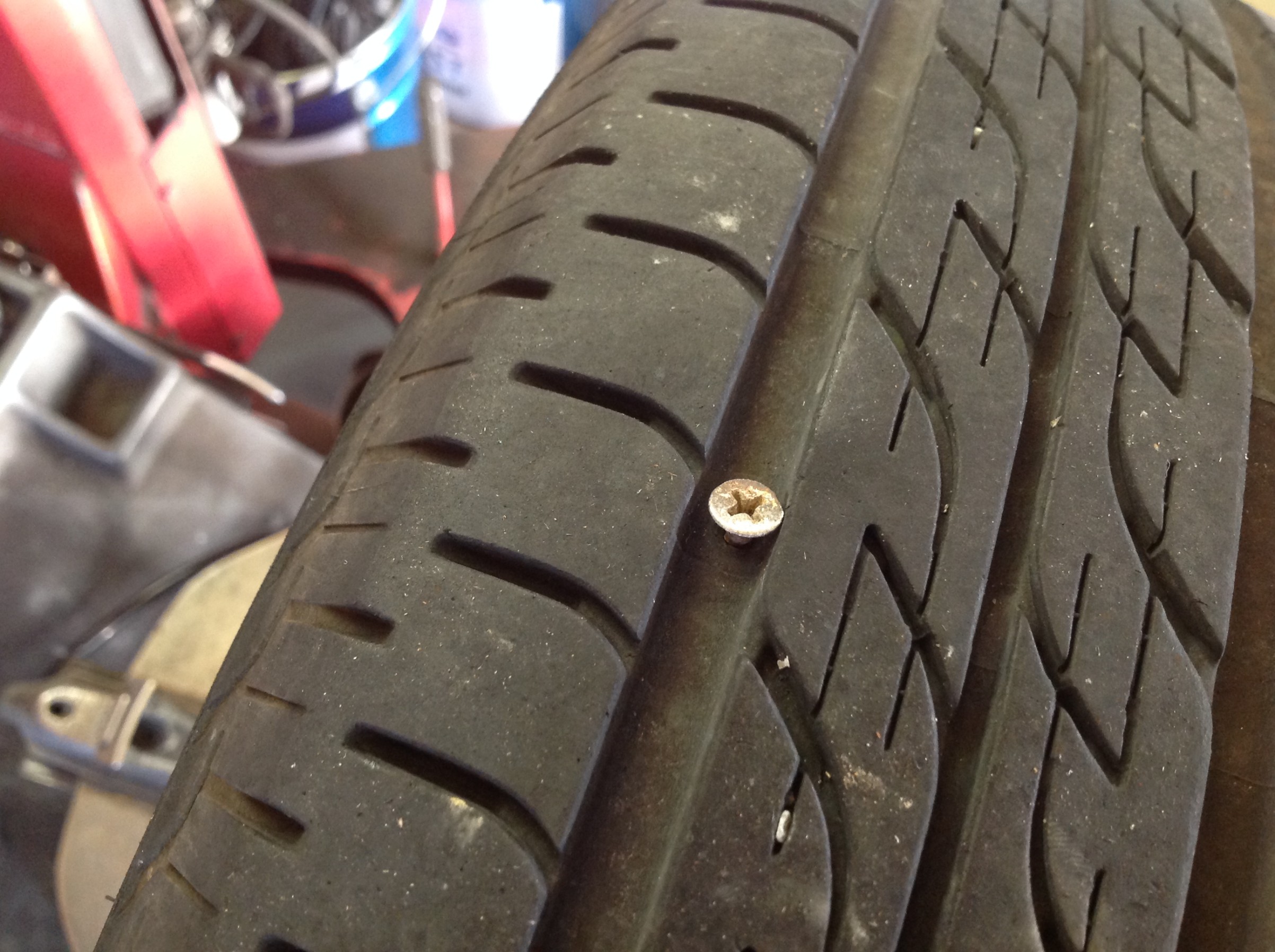 空気圧チェックをさせて頂いていると、1本だけ少ないものがありビスが…
