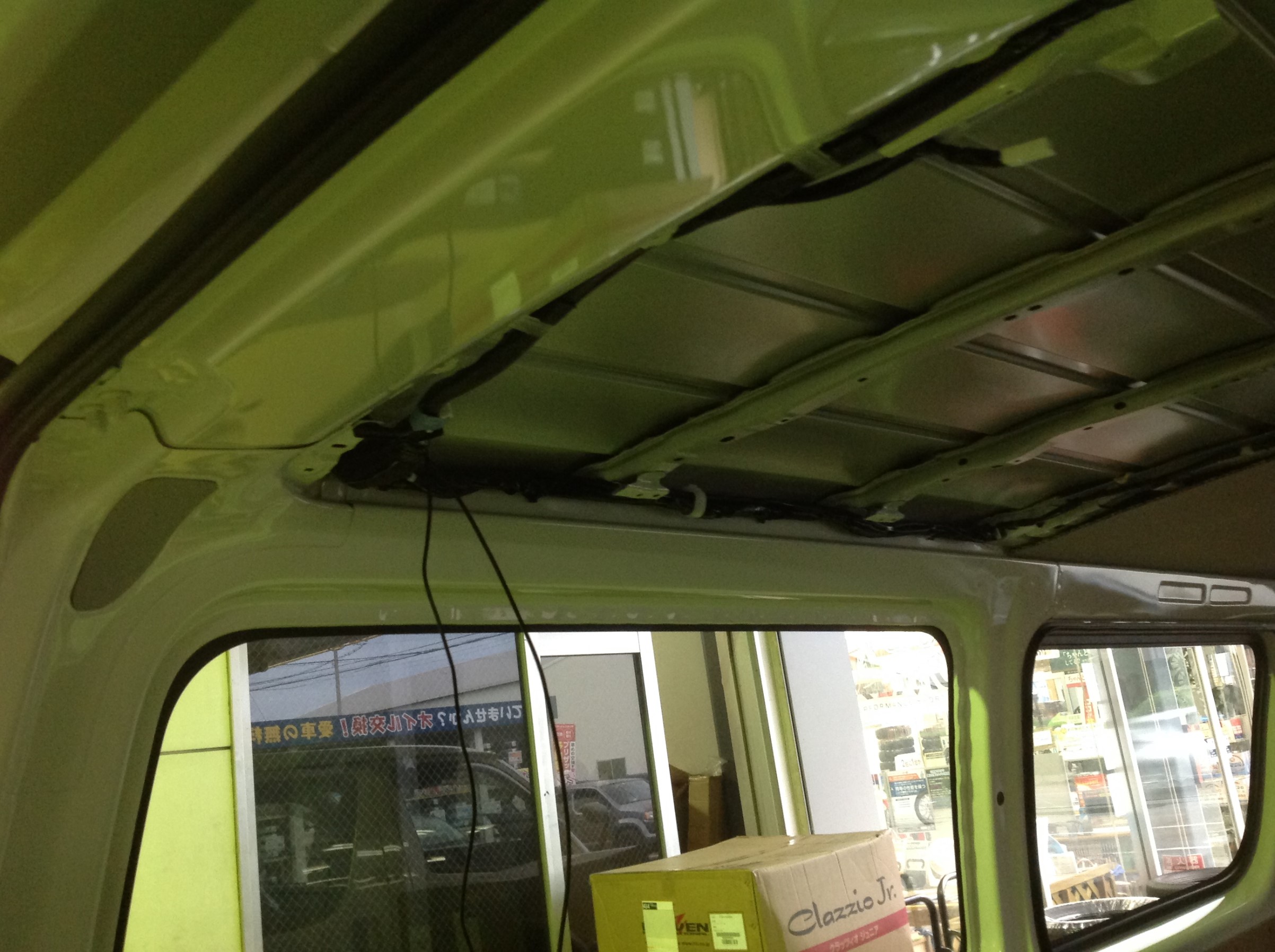 配線は天井の内張りを降ろしまして、フロントまで引き回し ♪