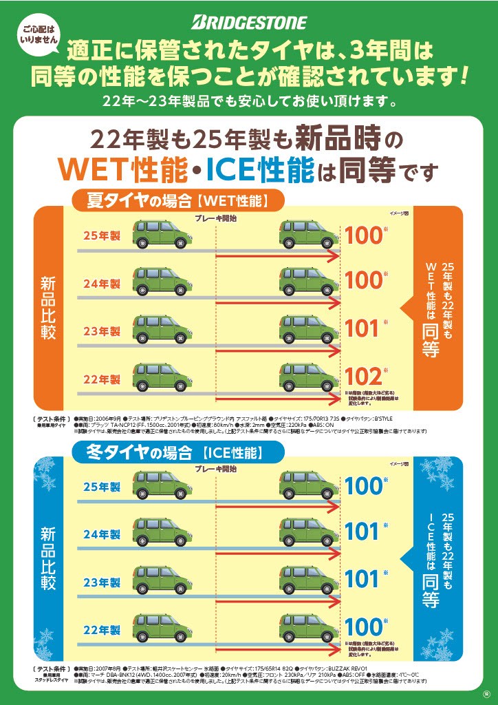 実は当店のようなタイヤ販売店などで適正な保管状況においては夏・冬タイヤともに3年間は同等の性能を保つことが確認されています。