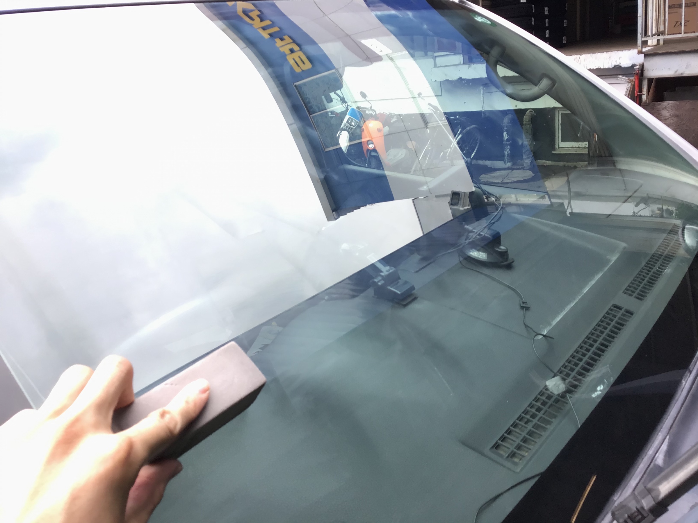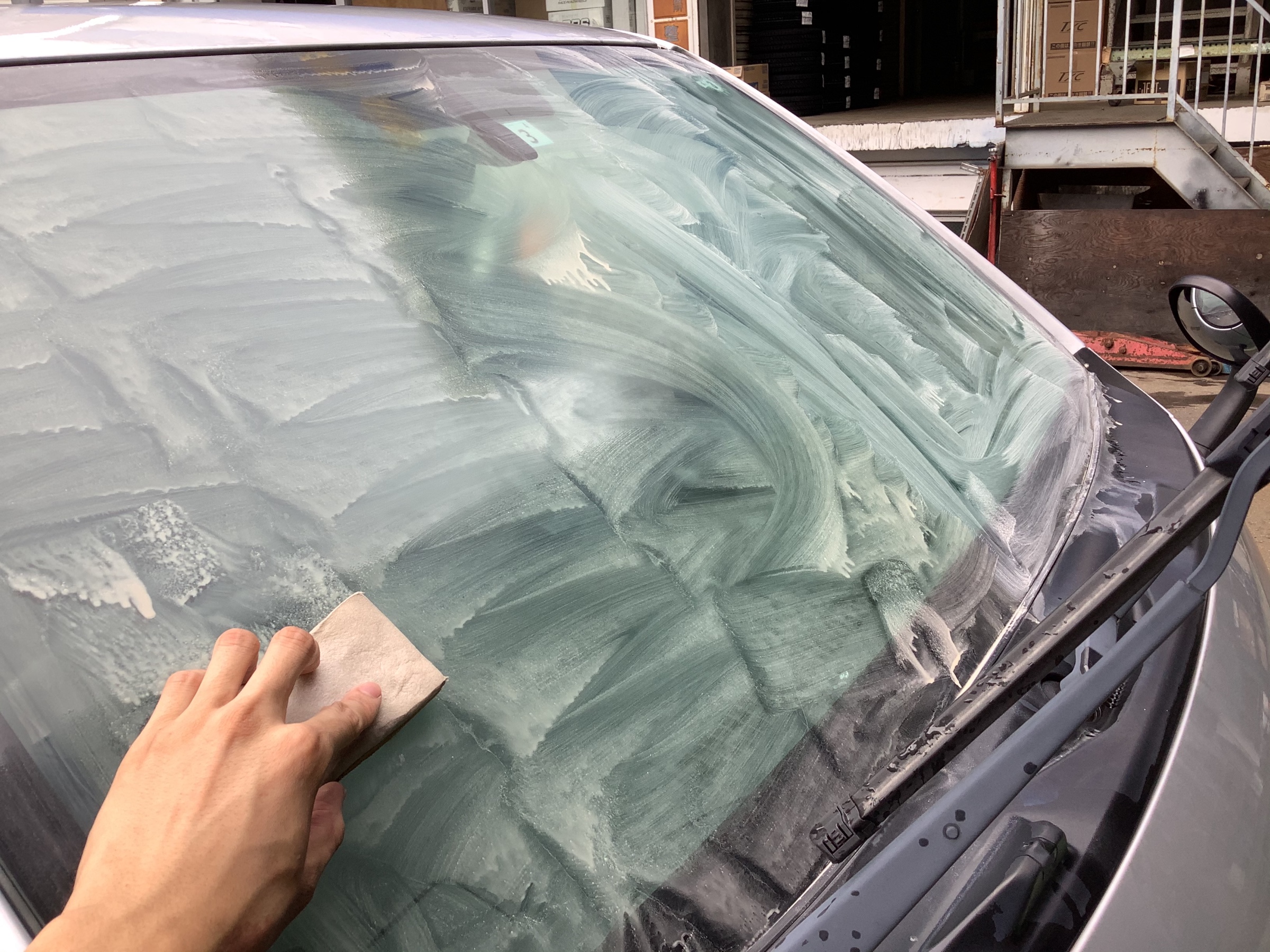 フロントガラスの油膜を除去していきます。