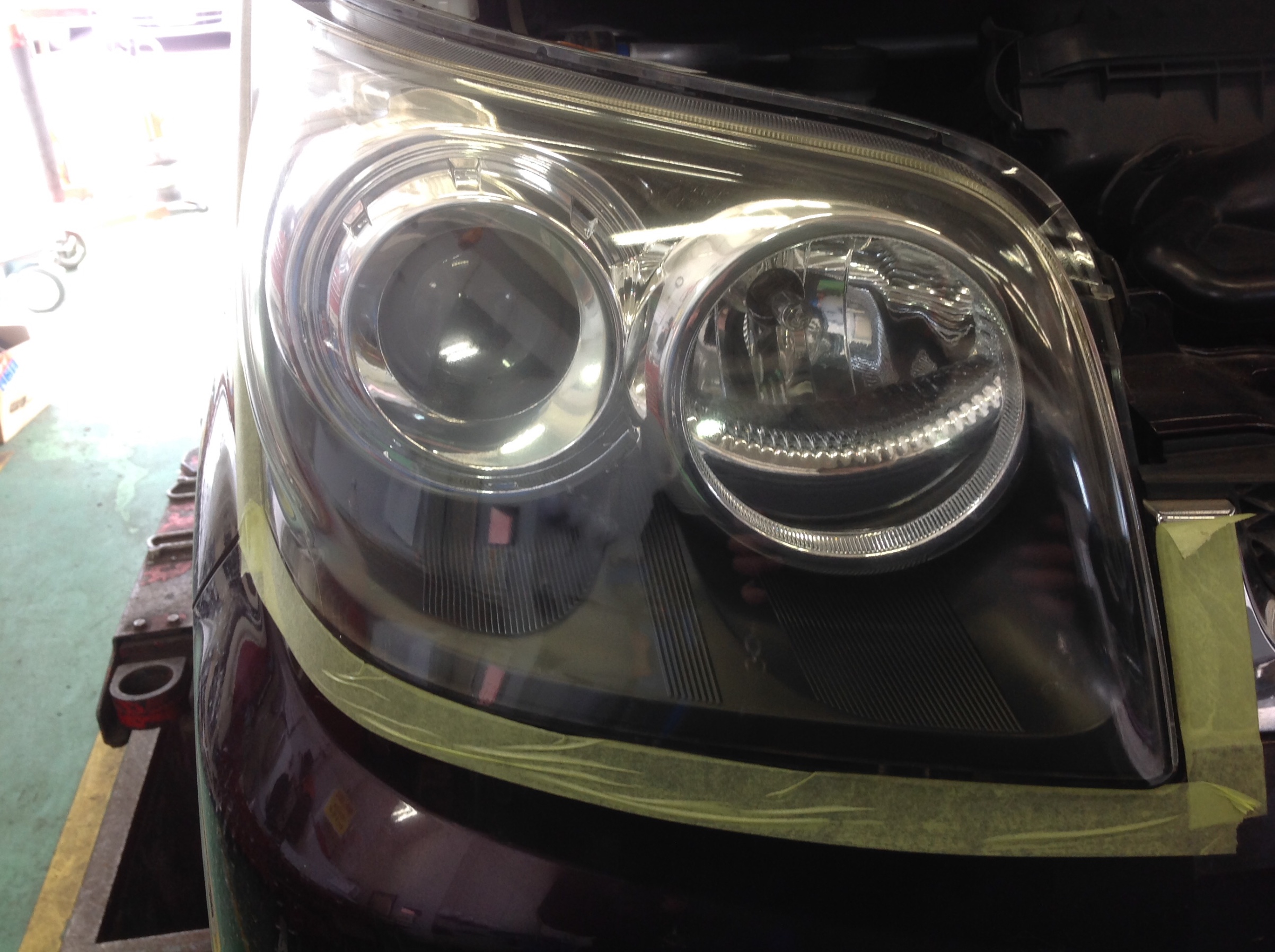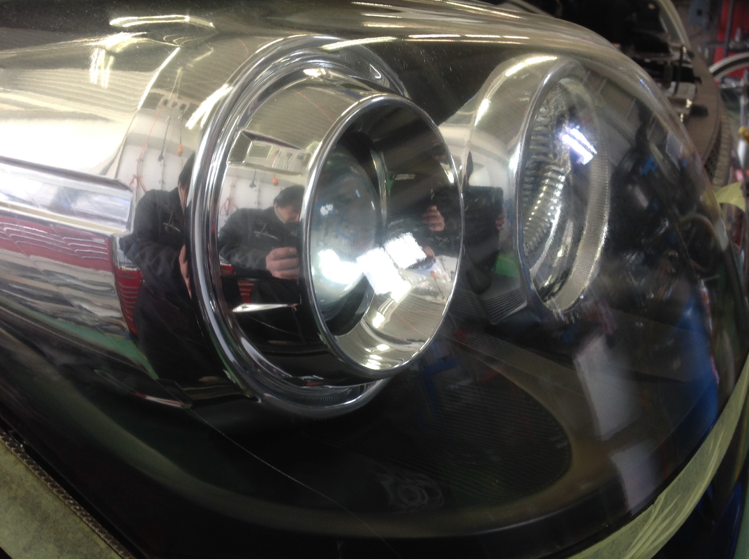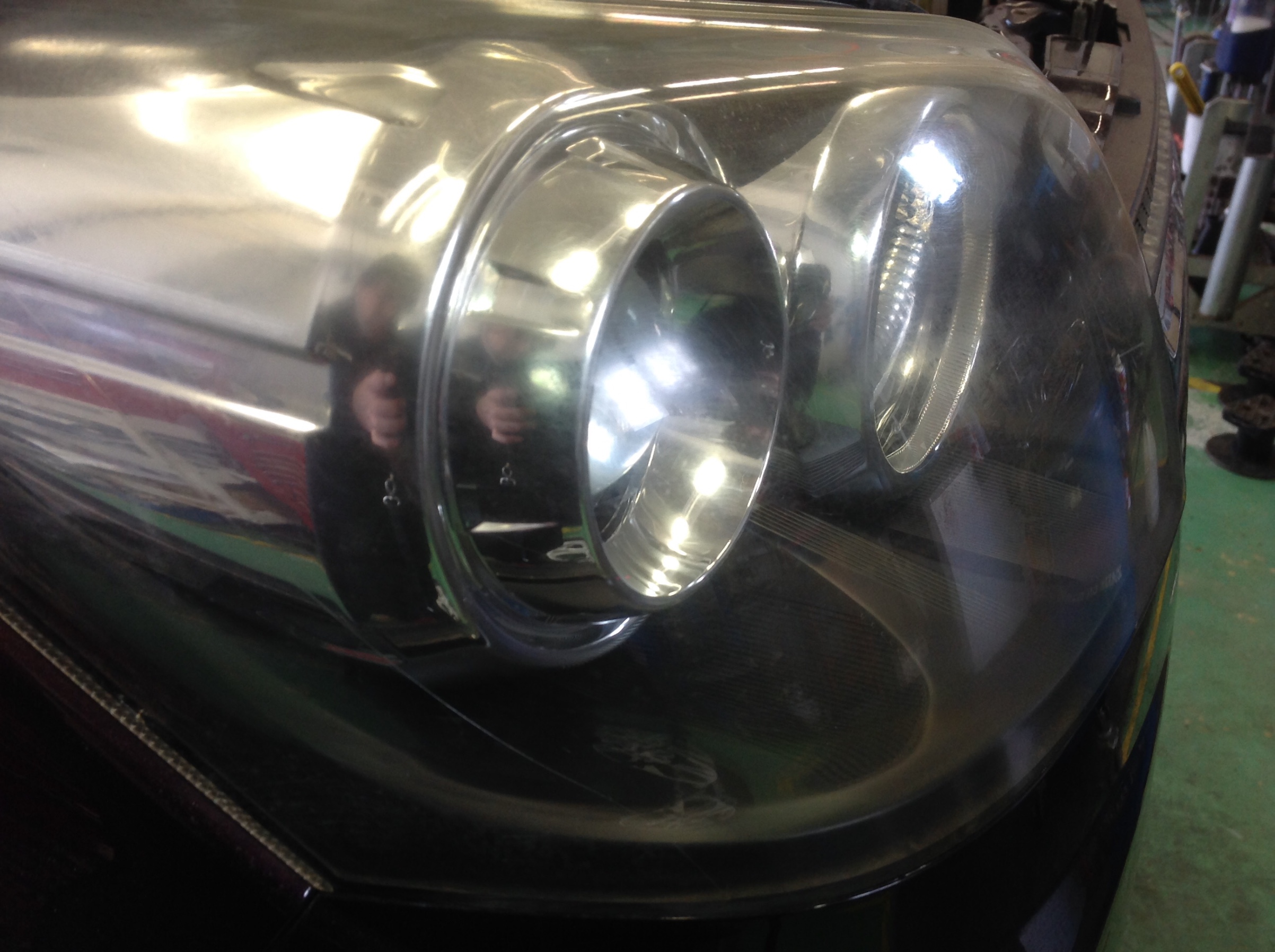 リフレクターに映るスタッフの影が、ボンヤリしてますよね。これはライト表面のコーティング剤の劣化でくすんでしまっているから。