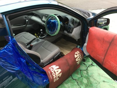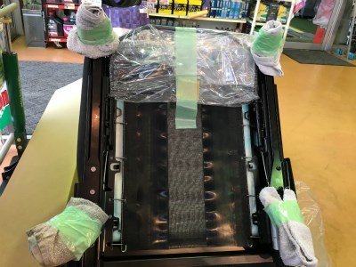 お次は純正シートの取り外し。車体に養生をします。