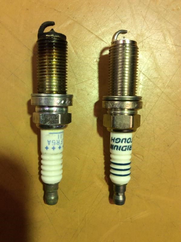 右が社外のイリジウムプラグで、左が純正の白金プラグになり先の電極に差が生まれます。一般的に細いほうが火花が強くなります。