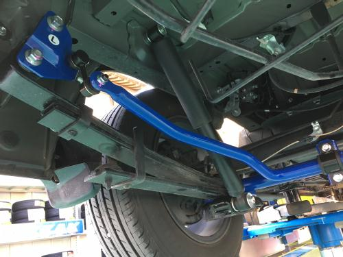 追加バーへ、更にスタビライザーを板バネの付け根に取り付けた金具と共に固定致します。