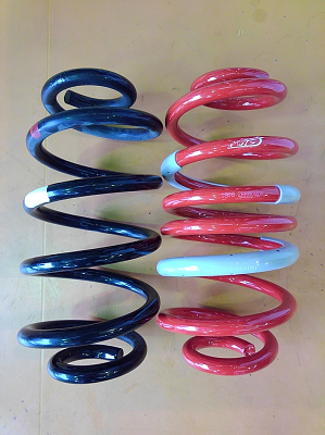 フロントスプリング:左の黒が純正で右の赤がタナベのDF210です。