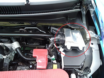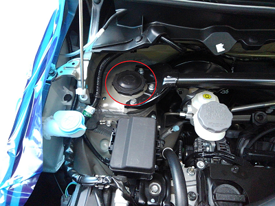 フロント左側:赤丸内のECUを外さないとアッパーマウントは見えません。