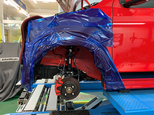 フロント、リアの作業付近にしっかりと養生を貼り、作業開始です。
