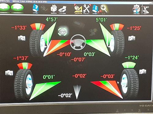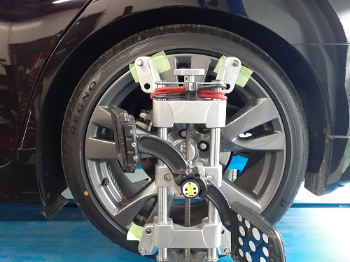 車両側でタイヤの取付角度を適正に修正するのがアライメント調整です。
