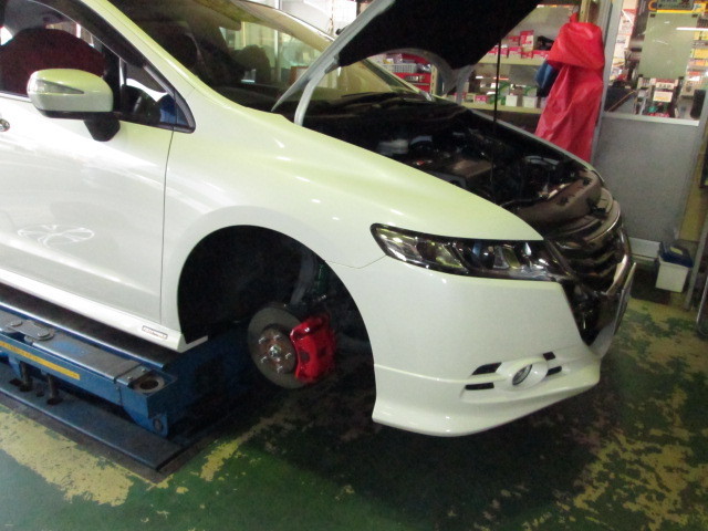 オッデセイは車高を下げるとキャンバーがマイナスに付きますので、タイヤが肩ベリしてしまいます。純正のアッパーアームは調整する機構がついていませんので、どうすることもできません!