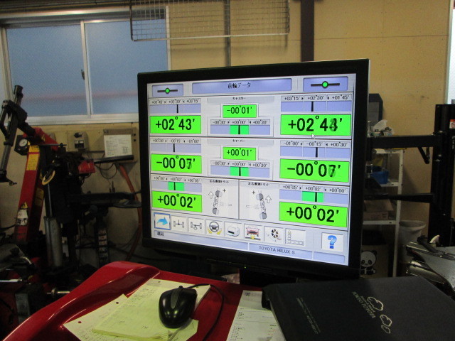 お車が少しフラフラする、ということでアライメント調整させていただきました。