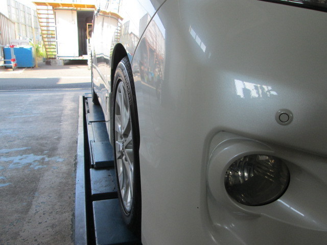 ダウンスプリング交換のみで、純正18インチホイール&タイヤを装着されている車両ですが、お客様ご自身がフェンダーギリギリまでホイールを外に出すようにセットされていました。しかしフロントのみ若干のタイヤはみ出しが発生してしまっておりましたので、フロントのキャンバー角を調整させていただいてフェンダー内に収める作業を実施いたしました。