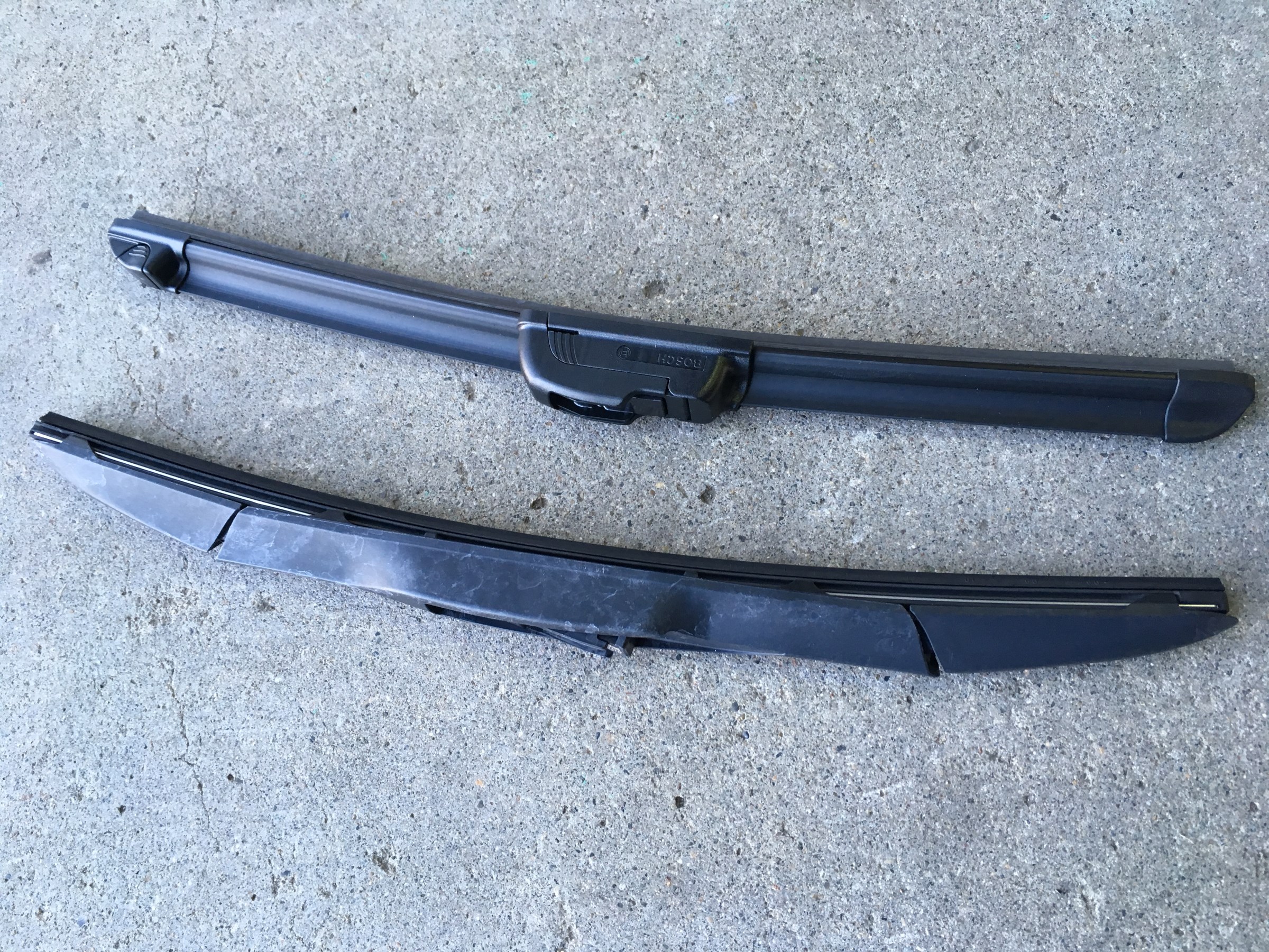 外して、ノーマルとボッシュを比較です、助手席側なので短いですが、厚みが結構違います。