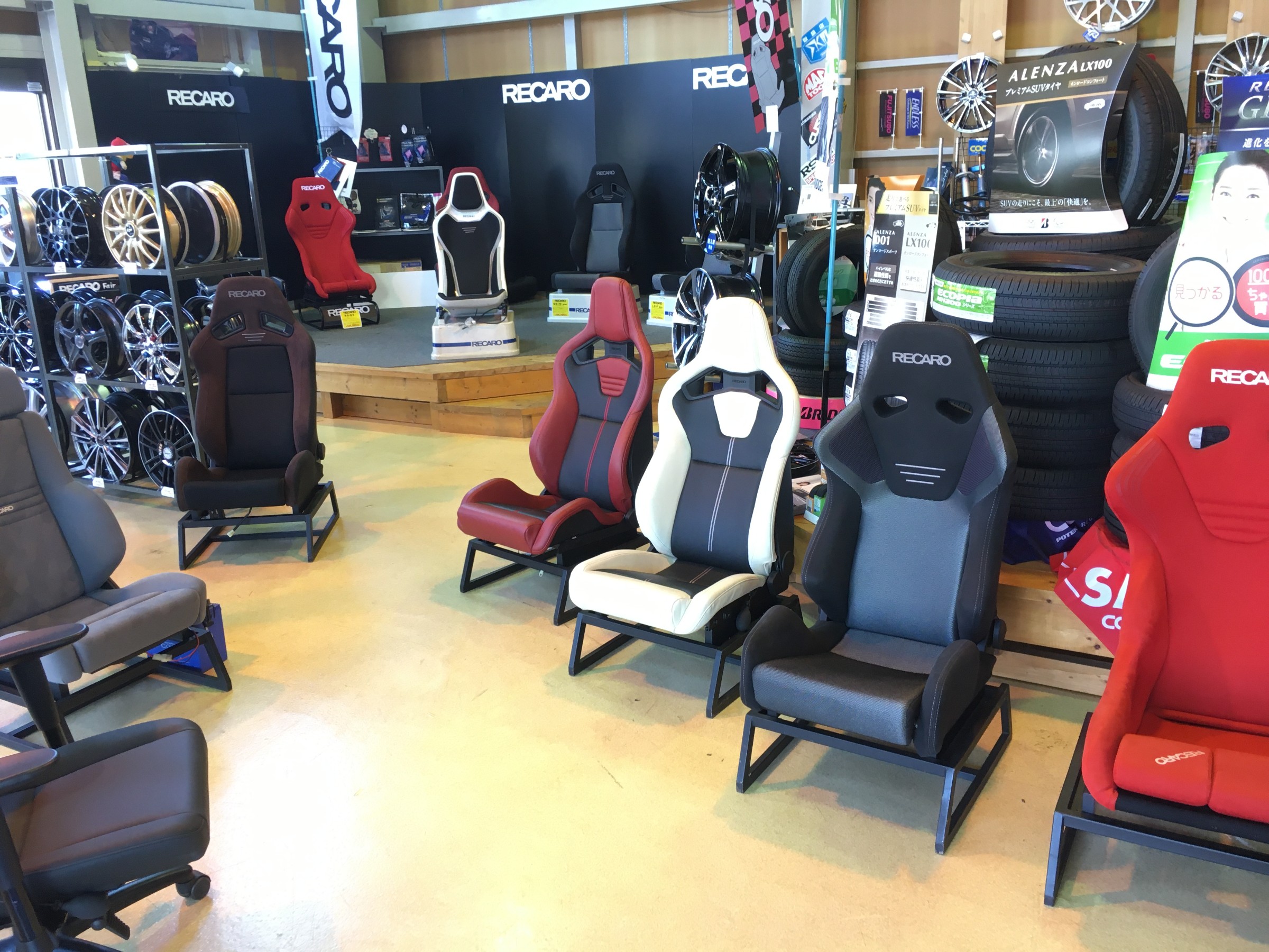ずらっと勢ぞろいのレカロシート!デモカー含め展示シート脚数はおよそ17脚。