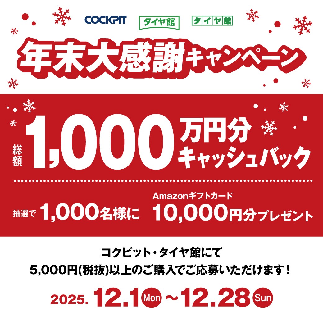 コクピット・タイヤ館では、2025/12/1より総額1,000万円分のキャッシュバックにご応募いただける年末大感謝キャンペーンを開催中です。