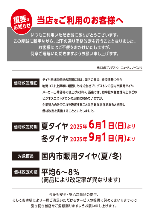 夏タイヤ→2025年6月より値上げ
