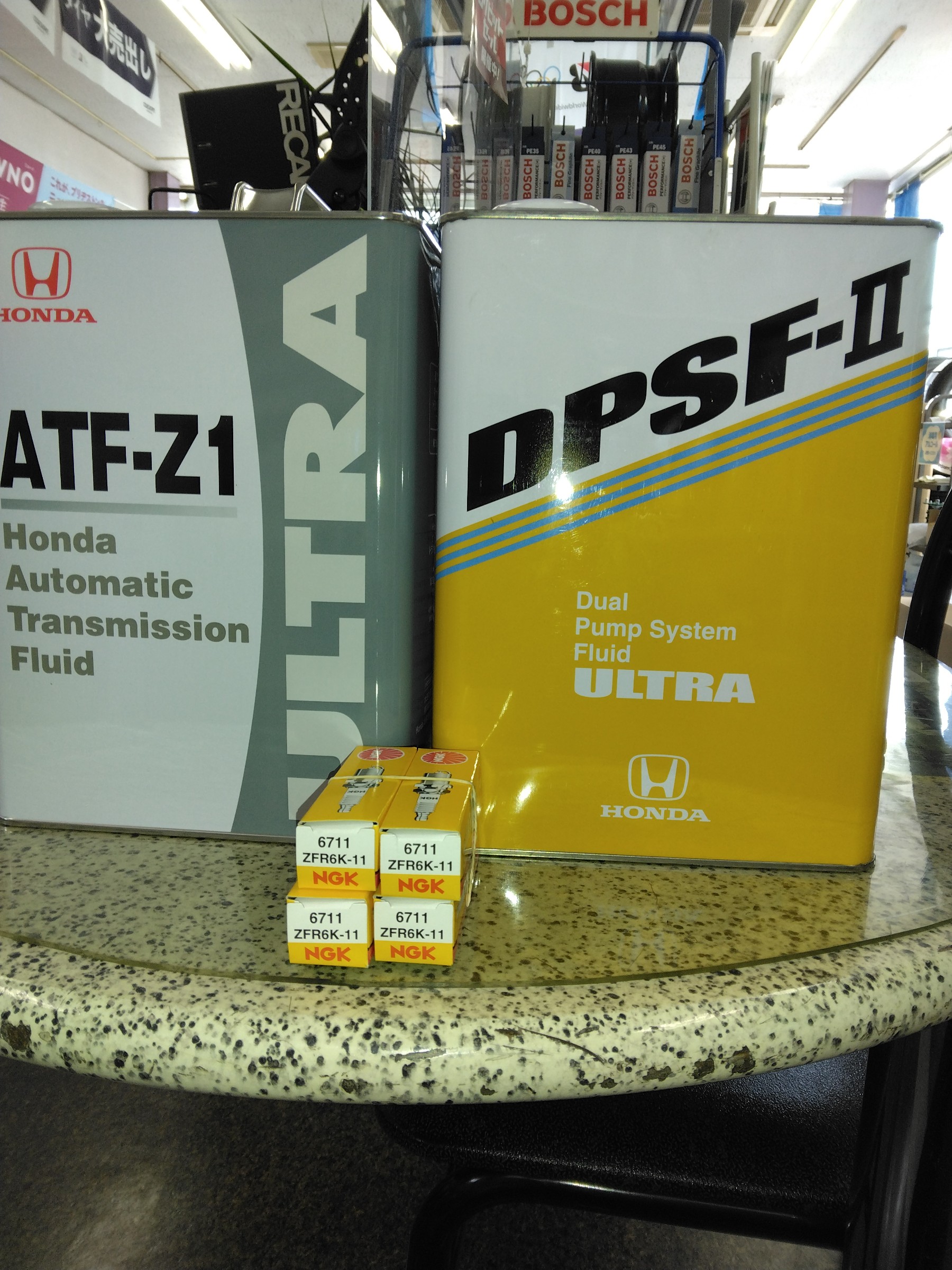 エンジンオイル、ATFオイル、リアデフオイル、プラグ、エアコンフィルターの交換でお預かりしました。