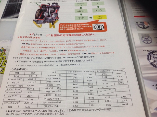 先日、車高調を取り付けましたフィットのお客様が、ジャダーにお困りとの事で、今回アライメント調整でご来店の際に、CVTオイルの交換とオイルメンテナンス剤 SOD-1 PLUSの施工を致しました。