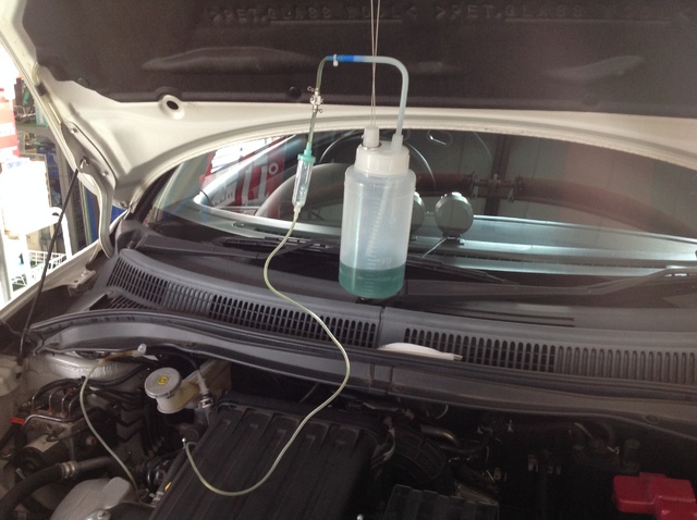 その後WAKO'Sさんの「RECS」も施工させていただきました。専用の溶剤をエンジン内部に循環させ、不純物を排出する作業です。