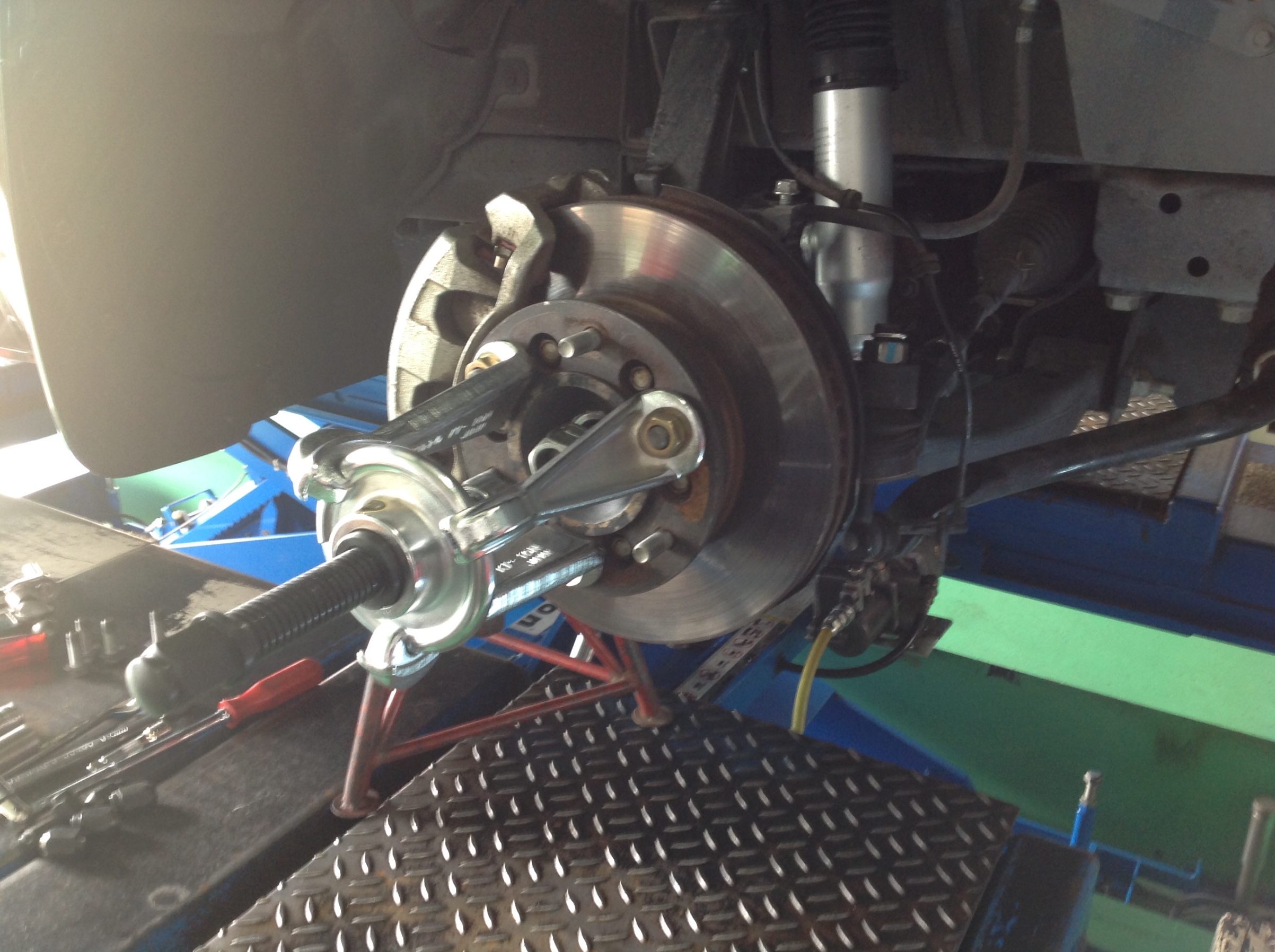 次にフロントのローター交換です。まだ車が新しいので、ハブも簡単に抜けるだろう思っていたのが甘かった。
