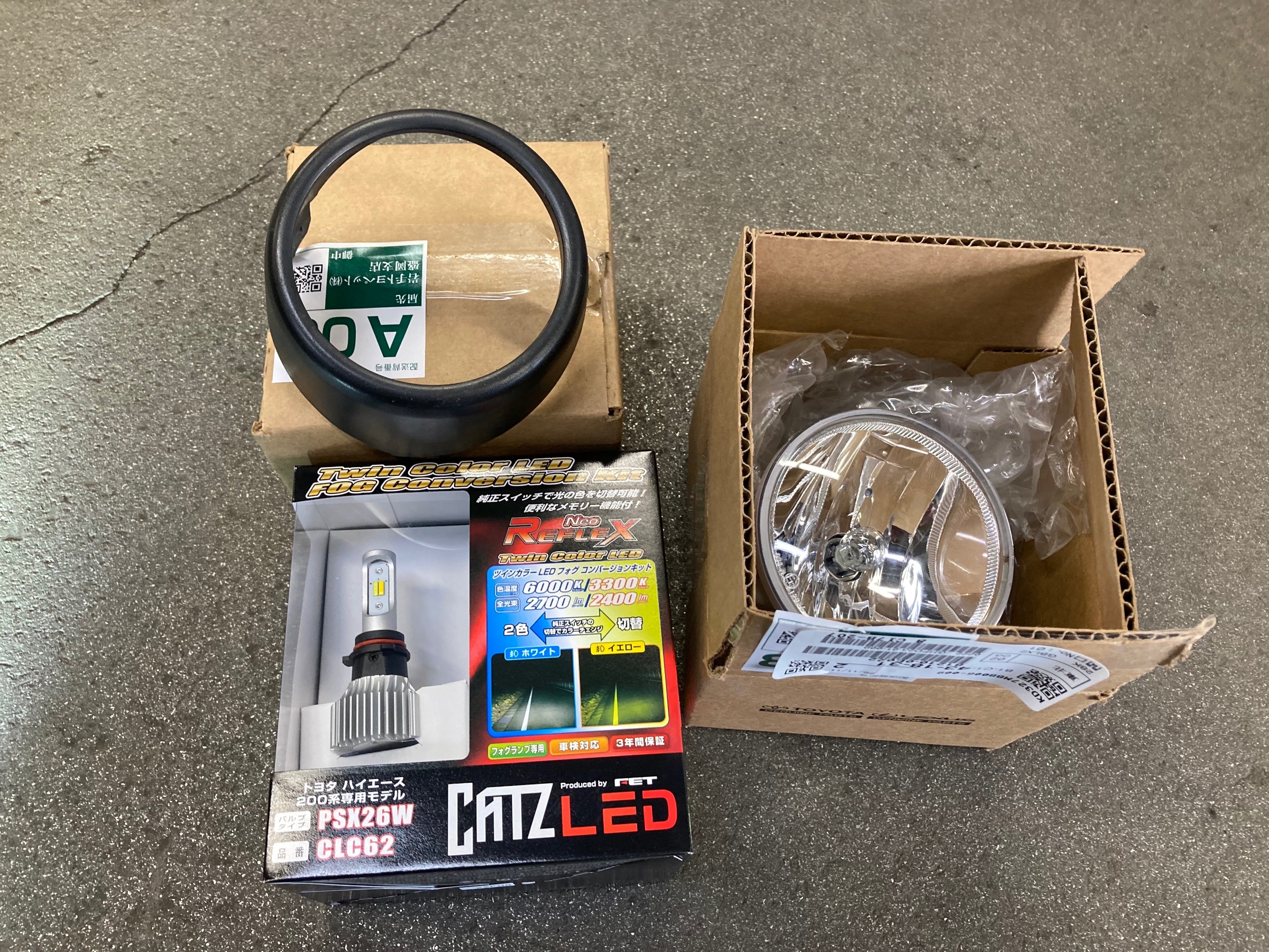 フォグランプの交換にてご入庫いただきましたが、装着させていただいたのは「ツインカラー」切替可能な「CATZ LED 200ハイエースフォグ専用モデル CLC62」でございます!