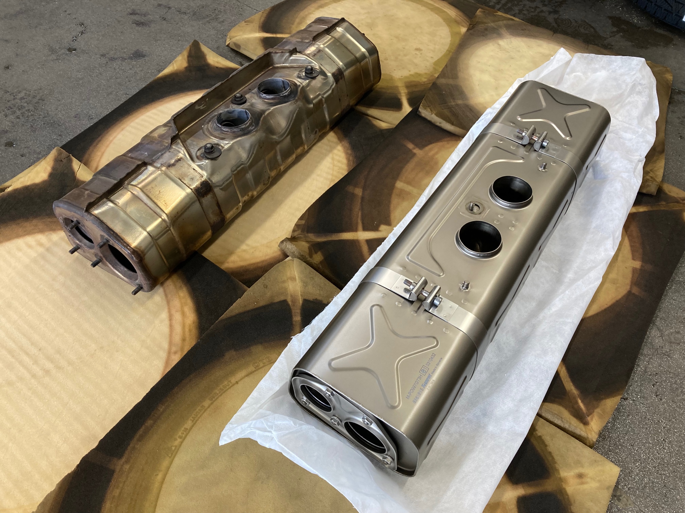厳重に梱包され到着した、チタン製の「スリップオンライン」エキゾースト。