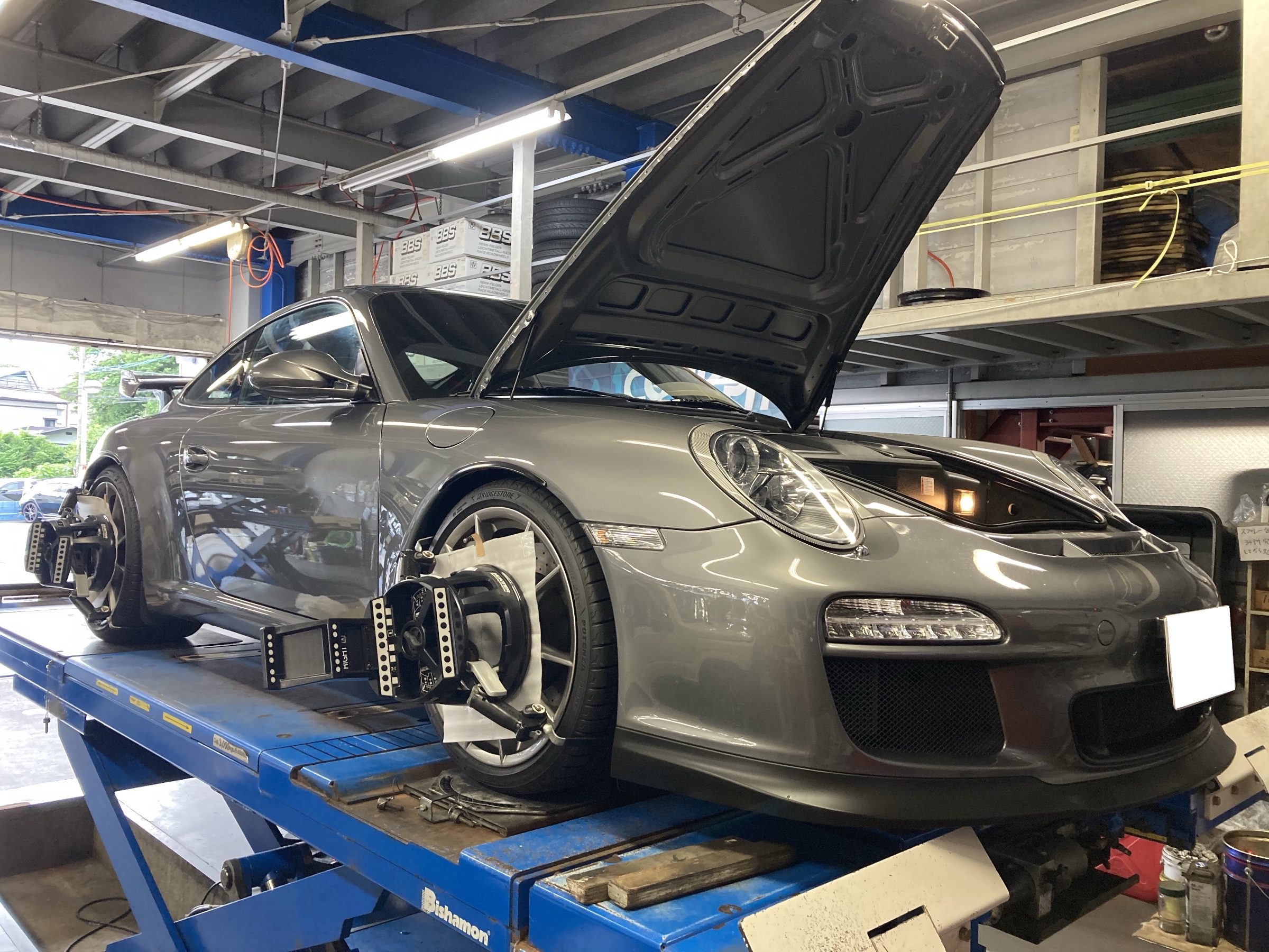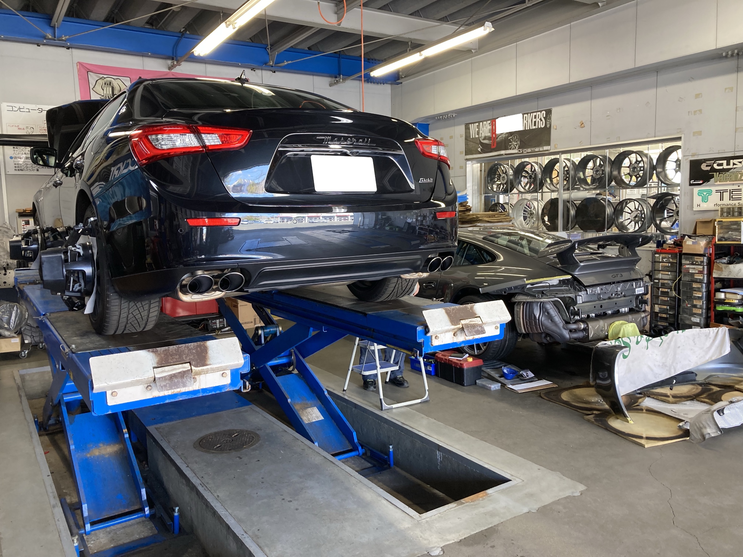 途中「マセラティ ギブリ」のアライメント調整の入庫でご入庫で、となりへ移動。
