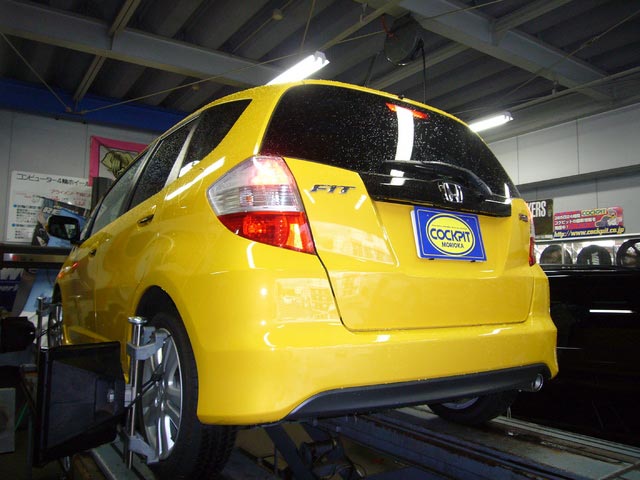 イエローのフィットRSは、アライメント調整でご入庫。データを見ながら、お客様好みの味付けに調整です。