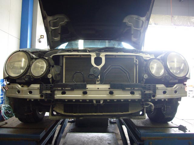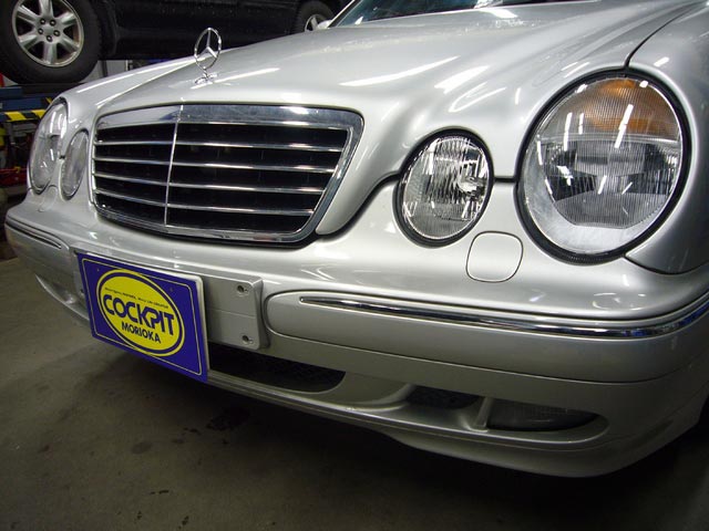 フロントバンパーを取り外したW210 メルセデスEクラスも同じく「HELLA]製キセノンヘッドライトへ交換。