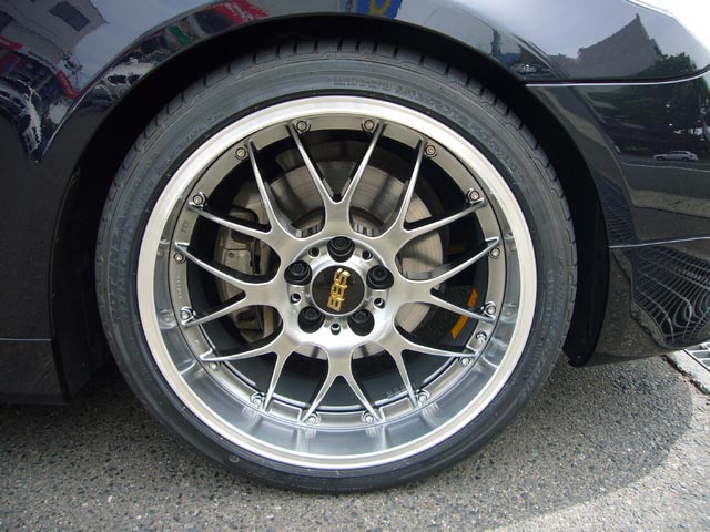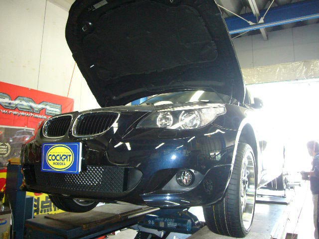 E60のお客様は、BBS RS-GT 19インチ+ポテンザ RE050をセット。もちろんセンターフィットにて車両へ装着です。同時に、エンジンオイルをNUTECに交換させていただきました。