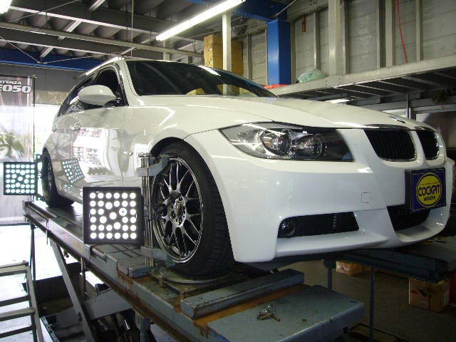E90のお客様は、足回り交換後の仕上げのアライメント調整でご入庫。ローダウン後、特にトーインの数値に異常がみられましたので、テスト走行を繰り返しながら調整です。