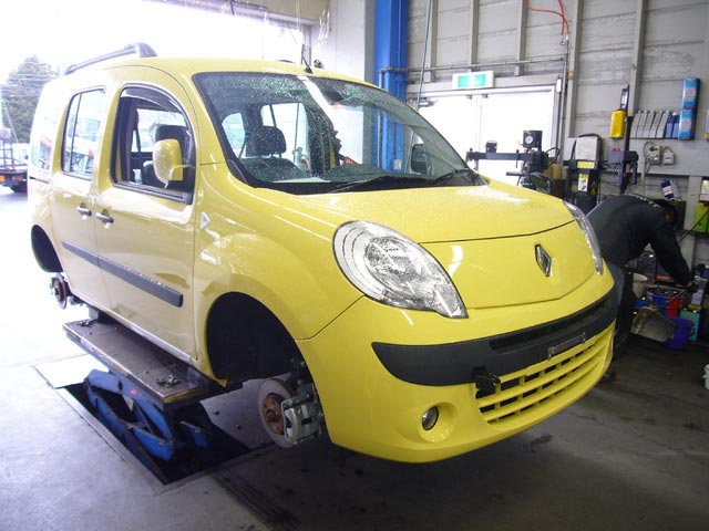 鮮やかなイエローのカングー(新車!)は、タイヤ組替えでご入庫です。