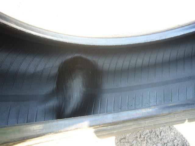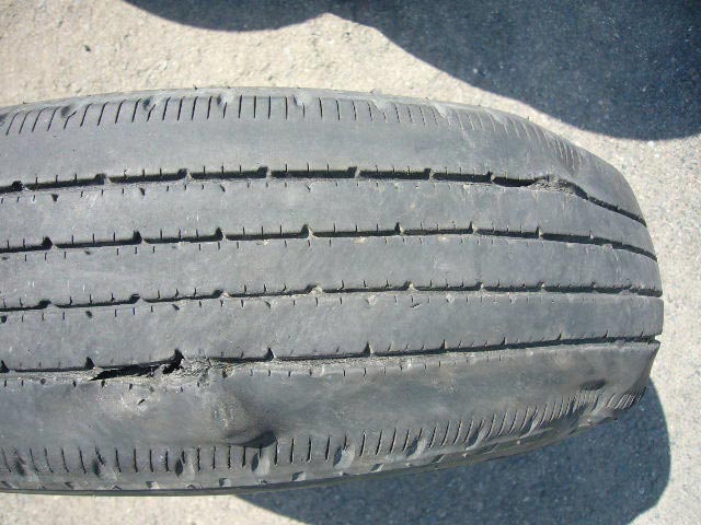 画像でおわかりいただけますが、トレッド面が変形し、タイヤの内側も大変なことに!