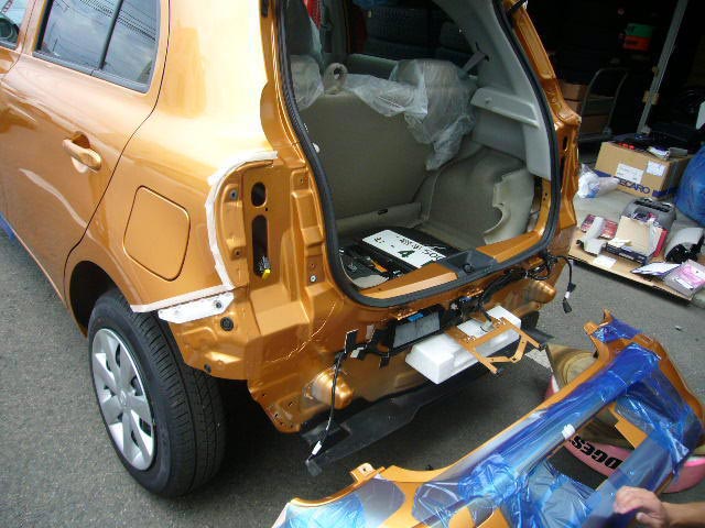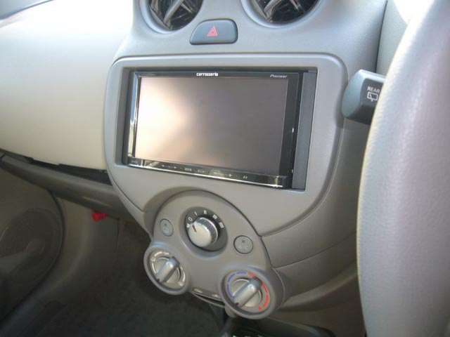 画像のK13マーチ(新車!)もナビ・スピーカー・リヤカメラの装着作業でご入庫いただきました。
