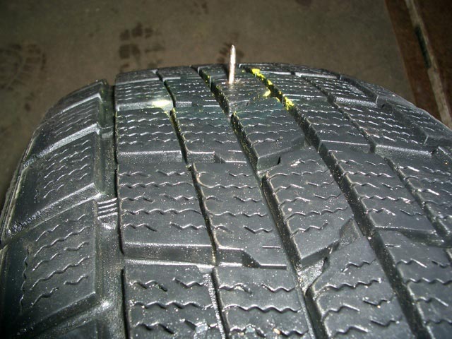 早速、タイヤを脱着し確認してみると、釘のようなものがゴムにめり込んで刺さっており、空気が少しずつ漏れている状態でした。