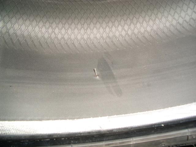 画像は、異物を取り出した状態ですが、穴近辺にもう1ヶ所漏れている小さな小さな穴があいており、この状態ではパンク修理は不可能。