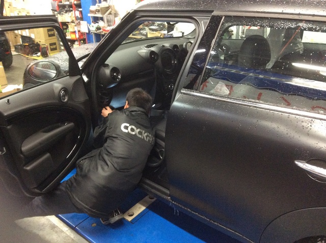 ミニクロスオーバーはポータブルナビとETCの取り付けです。クロスオーバーはツヤのないブラックでいつも以上に気をつけて作業です。保護テープを貼るのもこわいですね。
